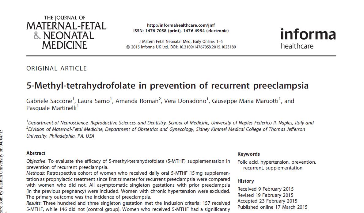 ایک 2015 اطالوی ریٹرو اسپیکٹیو کوہورٹ اسٹڈی (n = 303 خواتین جن میں پری ایکلیمپسیا ہے) نے ظاہر کیا کہ پہلی سہ ماہی سے روزانہ 15 ملی گرام 5-MTHF کی مجموعی تکرار کو کم کرتا ہے۔ پری لیمپسیا 39.7% سے 21.7% تک (یا 0.57، 95% CI 0.25–0.69)، شدید پری لیمپسیا 8.9% سے 3.2% (یا 0.44، 95% CI 0.12–0.97)، اور ابتدائی آغاز پری لیمپسیا 7.5% سے 1.9% تک (یا 0.34، 95% CI 0.07–0.87) [2]۔