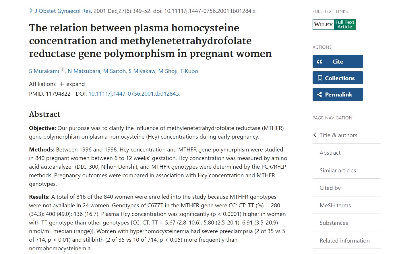2002 میں، ایک بڑے جاپانی گروہ کا مطالعہ (840 خواتین، 6-12 ہفتوں کا حمل) دی جرنل آف اوبسٹیٹرکس میں شائع ہوا اور گائناکالوجی ریسرچ نے سلسلہ کو مضبوط کیا: TT → Hcy اضافہ → منفی حمل نتائج