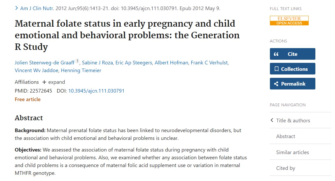 یہ مطالعہ، جنریشن آر کوہورٹ اسٹڈی کے نام سے جانا جاتا ہے اور مستند میں شائعامریکی جرنل آف کلینیکل نیوٹریشن، روشنی ڈالی ایک فولیٹ اور بچوں کی جذباتی نشوونما کے درمیان تعلق، اس سے الگ نیورل ٹیوب کے نقائص کو روکنے میں اس کا معروف کردار۔
