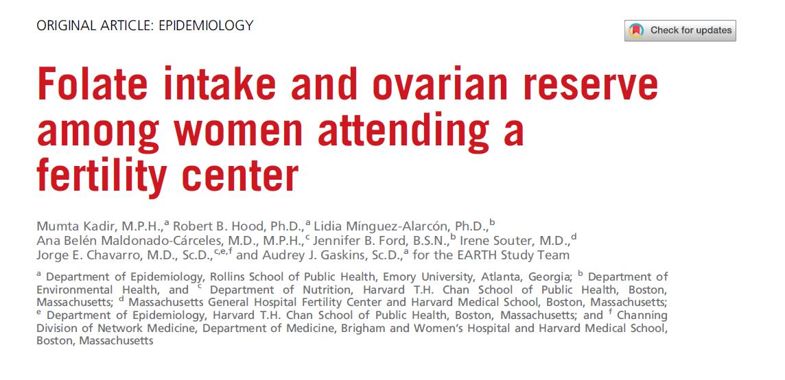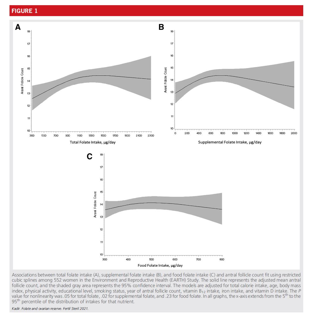 اس تحقیق میں 552 خواتین کے ڈیٹا کا تجزیہ کیا گیا جنہوں نے اس کا دورہ کیا۔ ریاستہائے متحدہ میں میساچوسٹس جنرل ہسپتال فرٹیلیٹی سینٹر، توجہ مرکوز کر رہا ہے فولک ایسڈ کی مقدار اور ڈمبگرنتی ریزرو فنکشن کے درمیان تعلق پر (انٹرل فولکل کاؤنٹ، اے ایف سی سے ماپا جاتا ہے)۔