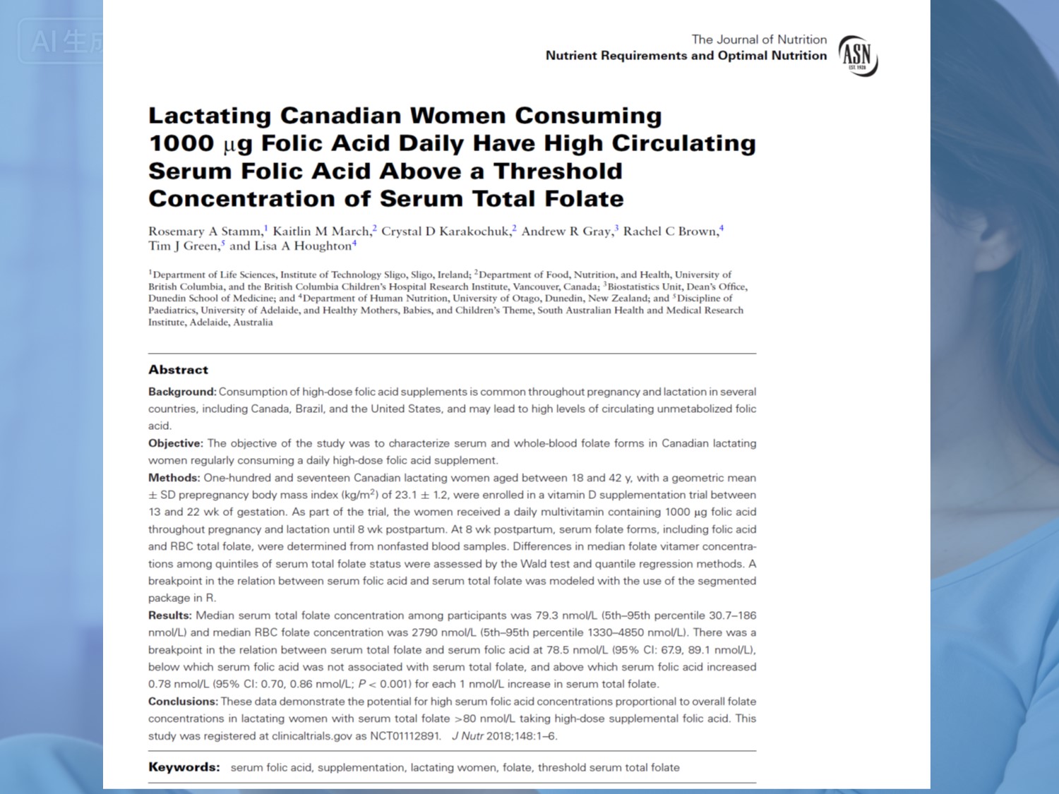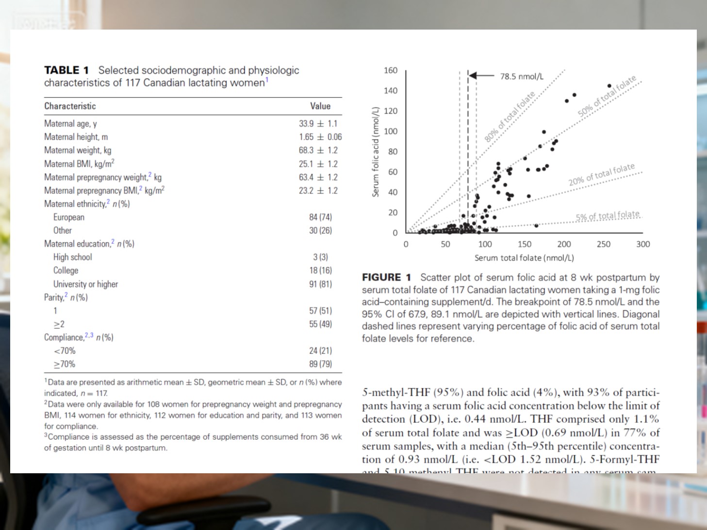 اس تحقیق میں دودھ پلانے والی 117 صحت مند خواتین کو شامل کیا گیا۔ حمل کے وسط سے آگے، انہوں نے 1000 لے لیا μجی فولک ایسڈ پلس 12 μوٹامن بی کی جی₁₂روزانہ، ترسیل کے بعد 8 ہفتوں تک جاری. خون کے نمونے۔ 8 ہفتوں کے نفلی میں جمع کیے گئے ان کا فولیٹ فارم کے لیے تجزیہ کیا گیا۔