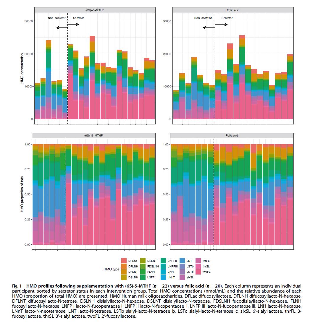 اس تحقیق سے ایک غیر متوقع نتیجہ سامنے آیا: اگرچہ کل HMO کی سطح دونوں گروپوں کے درمیان نمایاں طور پر مختلف نہیں تھی، چھاتی کے دودھ میں غیر میٹابولائزڈ فولک ایسڈ (UMFA) کا تناسب فولک ایسڈ گروپ 29% تک پہنچ گیا، جو کہ 5‑MTHF سے دس گنا زیادہ گروپ مزید خاص طور پر، ڈیٹا کے تجزیے سے پتہ چلتا ہے کہ UMFA کی سطحیں زیادہ تھیں۔ کم کل HMO ارتکاز سے وابستہ اور نمایاں طور پر کم 3′SL