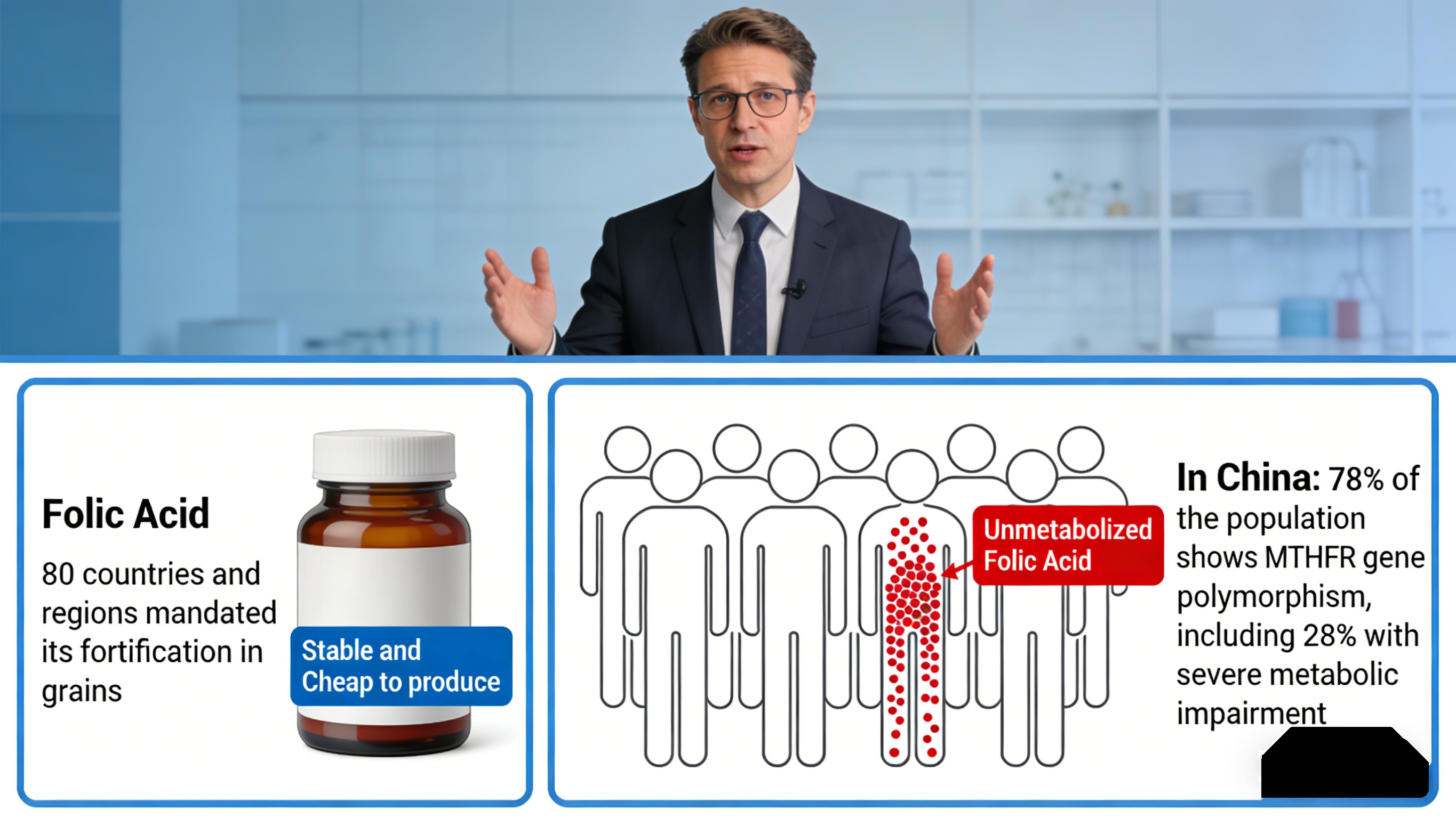 ابھی تک جاری کلینیکل اور غذائیت کی تحقیق کا انکشاف ہوا ہے۔ اس کی اچیلز ہیل: فولک ایسڈ میں اندرونی جسمانی سرگرمی کی کمی ہے اور ضروری ہے۔ جاذب بننے کے لیے چار انزیمیٹک مراحل سے گزریں۔ R&D شو میں میرے 19 سال چین میں حقیقی دنیا کا اثر: 78% آبادی MTHFR جین ظاہر کرتی ہے۔ پولیمورفزم، بشمول 28% شدید میٹابولک خرابی کے ساتھ — انزائم سرگرمی کم از کم 30% جنگلی قسم کے افراد۔
